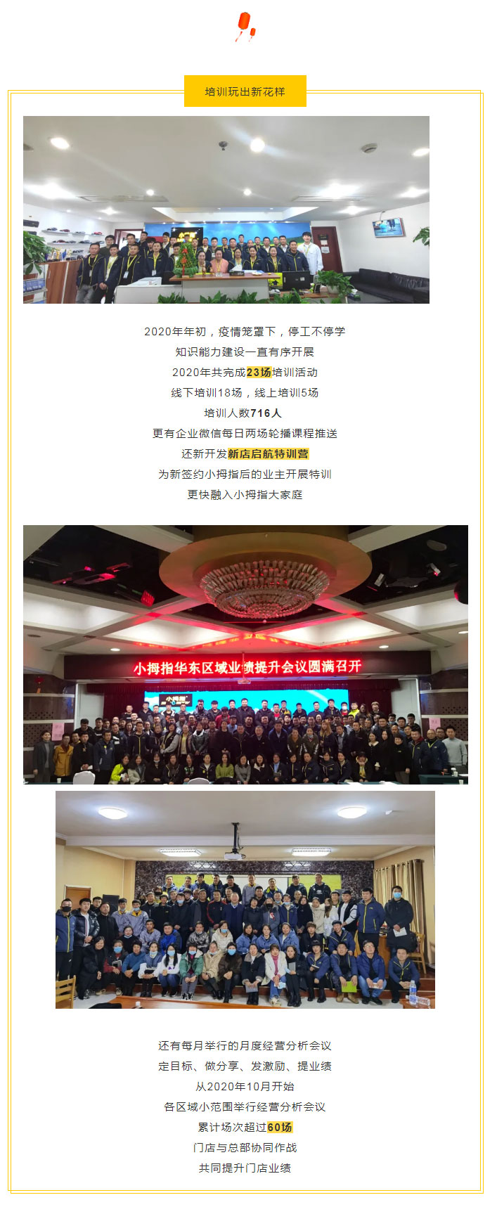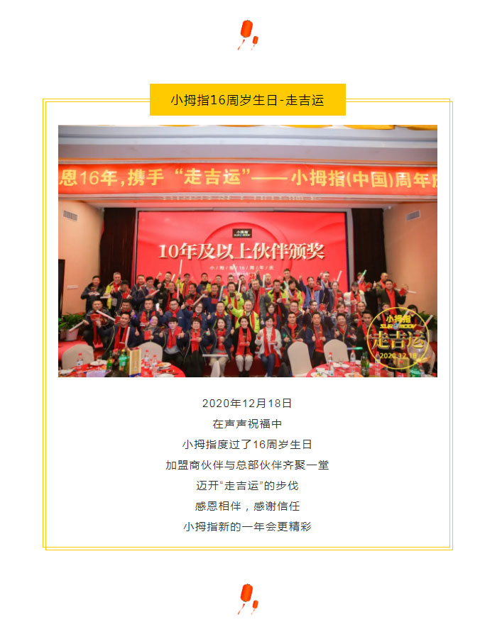 2020年,小拇指悶聲干了很多事,不管是產(chǎn)品銷量、門店運(yùn)營(yíng)管理經(jīng)驗(yàn)、拓店數(shù)量等等,都獲得飛躍發(fā)展,所有的成果都離不開伙伴們的支持與鼓勵(lì),希望2021年,小拇指人重新出發(fā)!